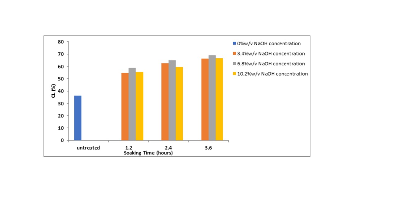 The shortage of sustainable fiber sources in the chemical industry highlights the need for alternatives to synthetic fibers, which have been widely used for years. This study examined the effect of NaOH treatment on the chemical composition of a novel fiber obtained from Nauclea latifolia bark wood (NLWBF). The objective was to investigate the influence of NaOH concentration and soaking time on NLWBF. Soaking time and NaOH concentration were varied from 1.2 to 3.6 hours and 3.4 to 10.2 % w/v, respectively. After collection, the NLWBF was processed into powdered form and treated to remove impurities. Both modified and unmodified NLWBF samples at optimum treatment conditions were structurally analyzed using Fourier Transform Infrared Spectroscopy (FTIR) to identify the organic functional groups present. The initial cellulose (CL), hemicellulose (HM), and lignin (LN) contents of NLWBF were 36.83%, 29.71%, and 31.29%, respectively. After chemical modification, the maximum cellulose content of 69.06% was obtained at 3.6 hours and 6.8% w/v NaOH. The optimum hemicellulose content was 18.14%, recorded at 2.4 hours and 6.8% w/v. FTIR spectra revealed the presence of OH, –COOH, C=O, C–O, and C–O–C groups, with noticeable shifts after NaOH treatment, confirming chemical modification. These changes indicated a reduction in hemicellulose and lignin, thereby enhancing the cellulose content of NLWBF. The results demonstrate that NaOH-treated NLWBF, with its improved cellulose composition, holds strong potential as a sustainable raw material for industrial paper.